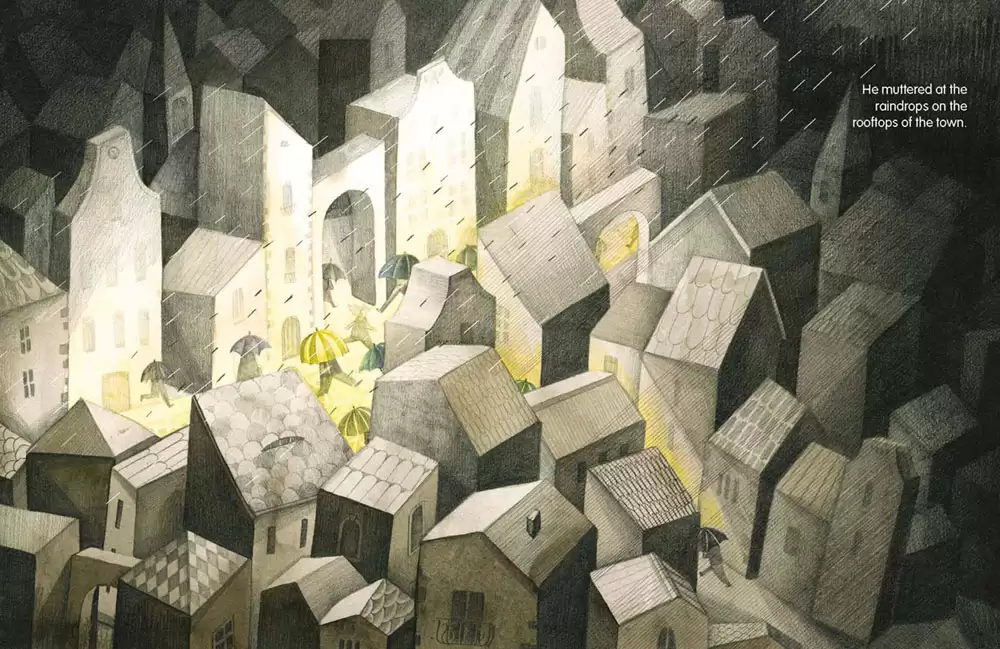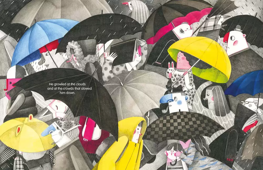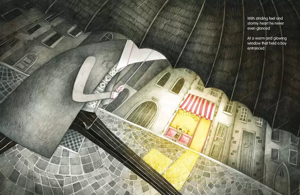 The weather has never been worse. The man with the stormy heart is soaked and he’s going to be late! His mood is as black as the sky. Outside a nearby patisserie, a little boy stands under the shelter of its awning, gazing at the beautiful treats on display. When the wind snatches the man’s umbrella and drops it at the child’s feet, can this hasty curmudgeon slow down long enough for an unlikely friendship to blossom?